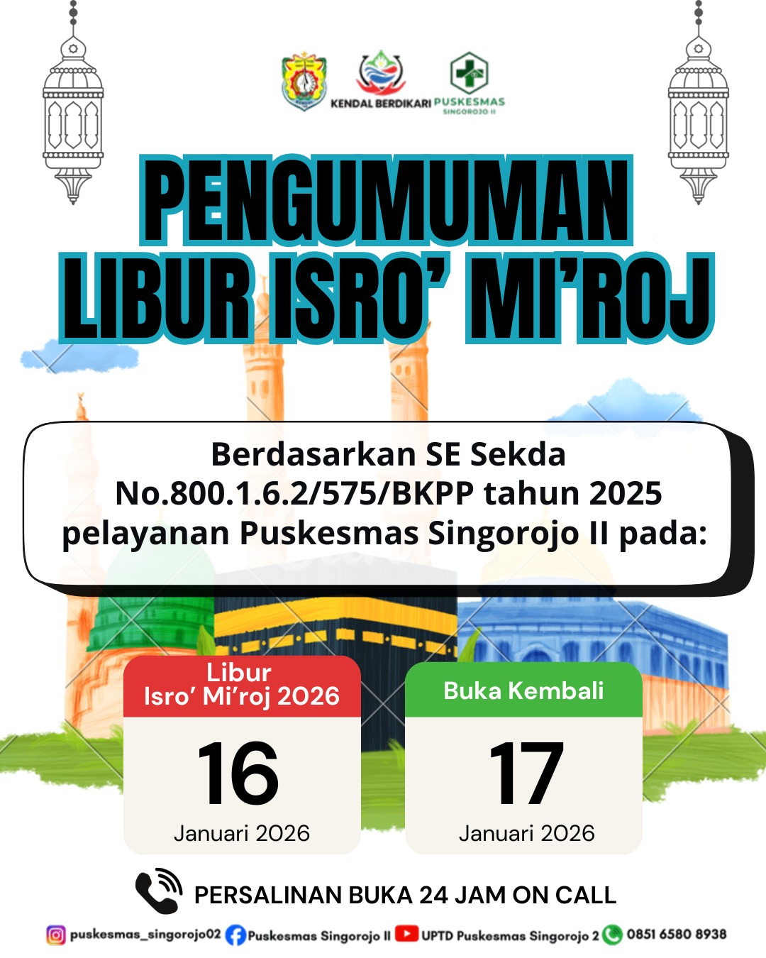 Bertepatan libur isra' mi'raj hari Jum'at, 16 Januari 2026 pelayanan Puskesmas Singorojo II TUTUP buka kembali hari Sabtu, 17 Januari 2026